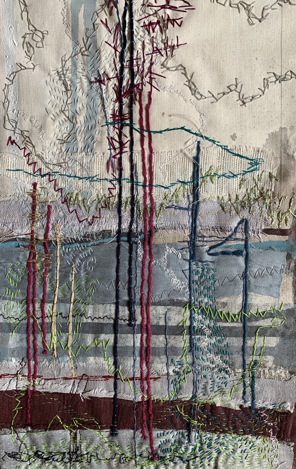 I use a pre-selected limited range of acrylic paint to pour and scrape colours both horizontally and vertically. I then work with a found palette of recycled fabric colours and textures whose selection contemplates a duality of textural surface and illusion of created space.